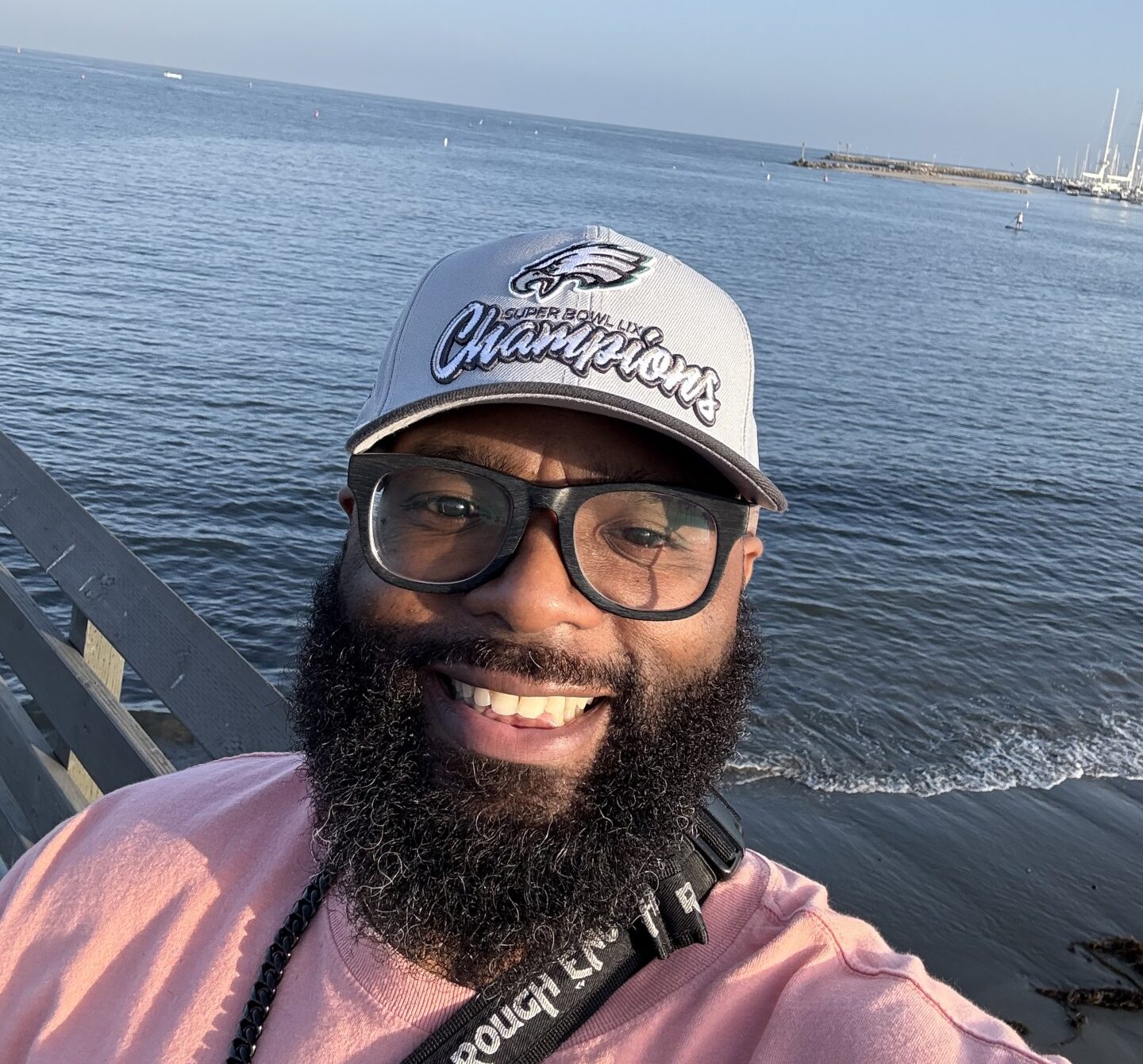 Headshot of Clinton Tyler, an African-American man standing and smiling on the side of a boat. He has a black beard and is wearing glasses and a baseball-type white cap.